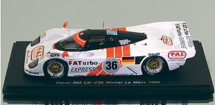 In 1:43 scale by Spark Model, this is the 1994 Porsche Dauer as driven to victory at LeMans by Dalmas, Haywood, and Baldi. Superb detail, these are some of the best finished models on the market today.